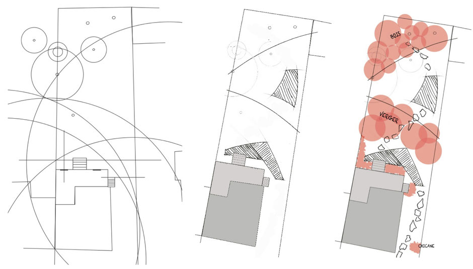 Nous tirons des diagonales courbes en éventail pour casser la rigueur existante, élargir le terrain, lui inventer de nouvelles limites. Ces diagonales créent des terrasses qui exploitent les