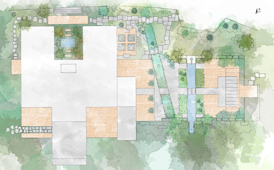 La maison présente une structure cruciforme, ouverte sur les quatre côtés. Nous imaginons pour ces quatre expositions, quatre jardins de proximité. Chacun d’eux, avec sa propre identité, joue une