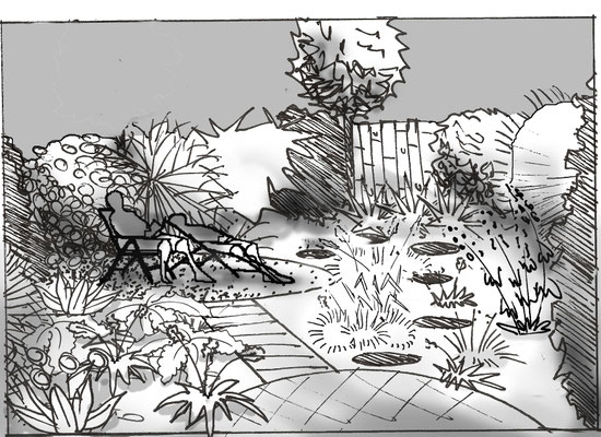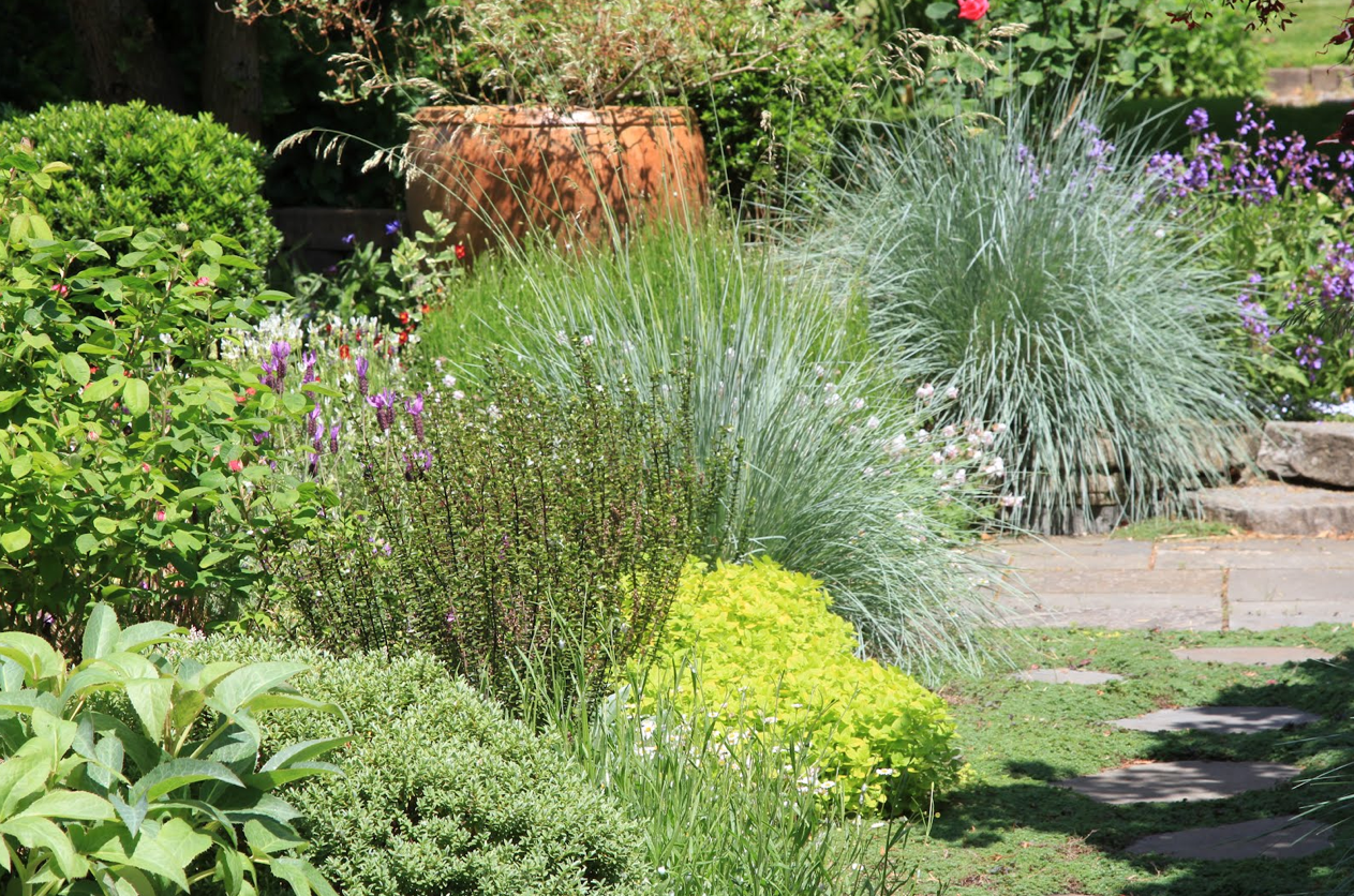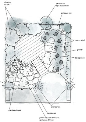 C'était un tout petit endroit, juste un carré de pelouse cerné de haies persistantes. Les propriétaires voulaient en faire un jardin (et dans le même geste, se débarrasser des corvées de taille et de tonte). Alors nous avons dessiné une clairière. En trois pas, on a quitté l'univers de la maison pour investir un tout autre monde, un monde de parfums, de couleurs, d'ombres et de lumière. Le tout petit jardin en a presque oublié ses limites.