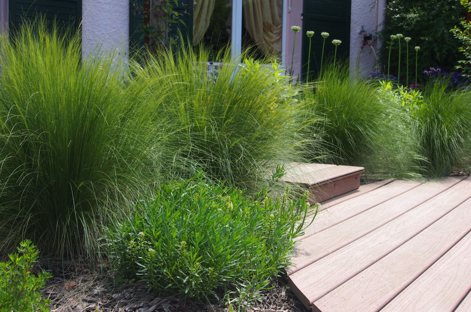C'était un tout petit endroit, juste un carré de pelouse cerné de haies persistantes. Les propriétaires voulaient en faire un jardin (et dans le même geste, se débarrasser des corvées de taille et de tonte). Alors nous avons dessiné une clairière. En trois pas, on a quitté l'univers de la maison pour investir un tout autre monde, un monde de parfums, de couleurs, d'ombres et de lumière. Le tout petit jardin en a presque oublié ses limites.
