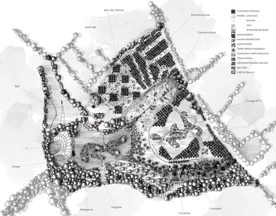 mouvement. C’est en modelant ces 2 forces que nous donnons forme au jardin. Une fois le système mis en place, les lignes, les contours, les pleins et les vides de l’espace se profilent.